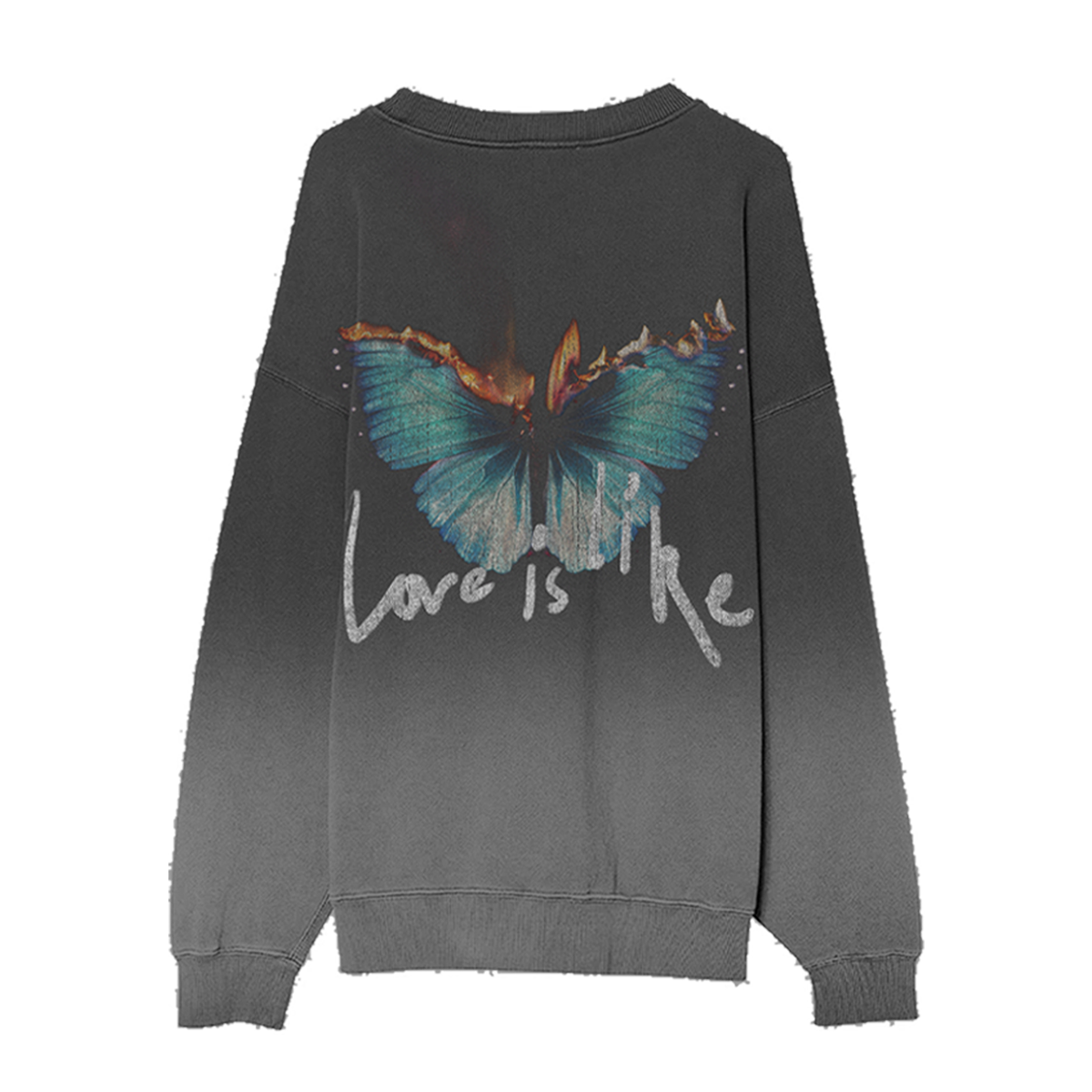Dark gray, vintage wash unisex crewneck features Love is Like album art on front and back.