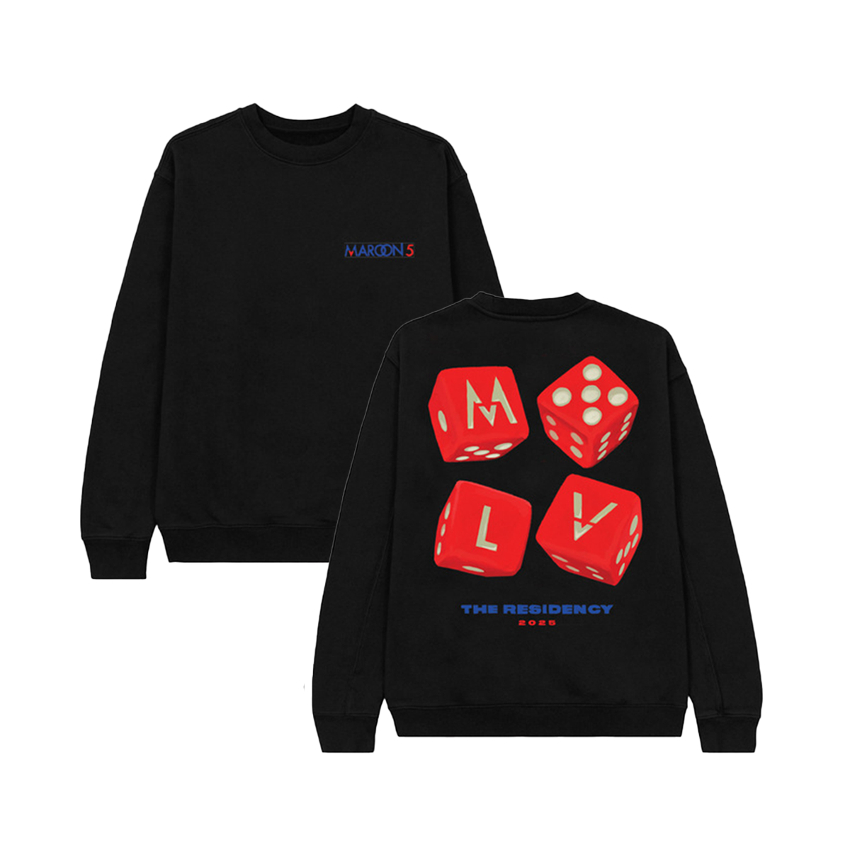 Black M5LV 2025 crewneck featuring Maroon 5 logo on front and dice art on back. Unisex, 80% ringspun US cotton, 20% polyester.